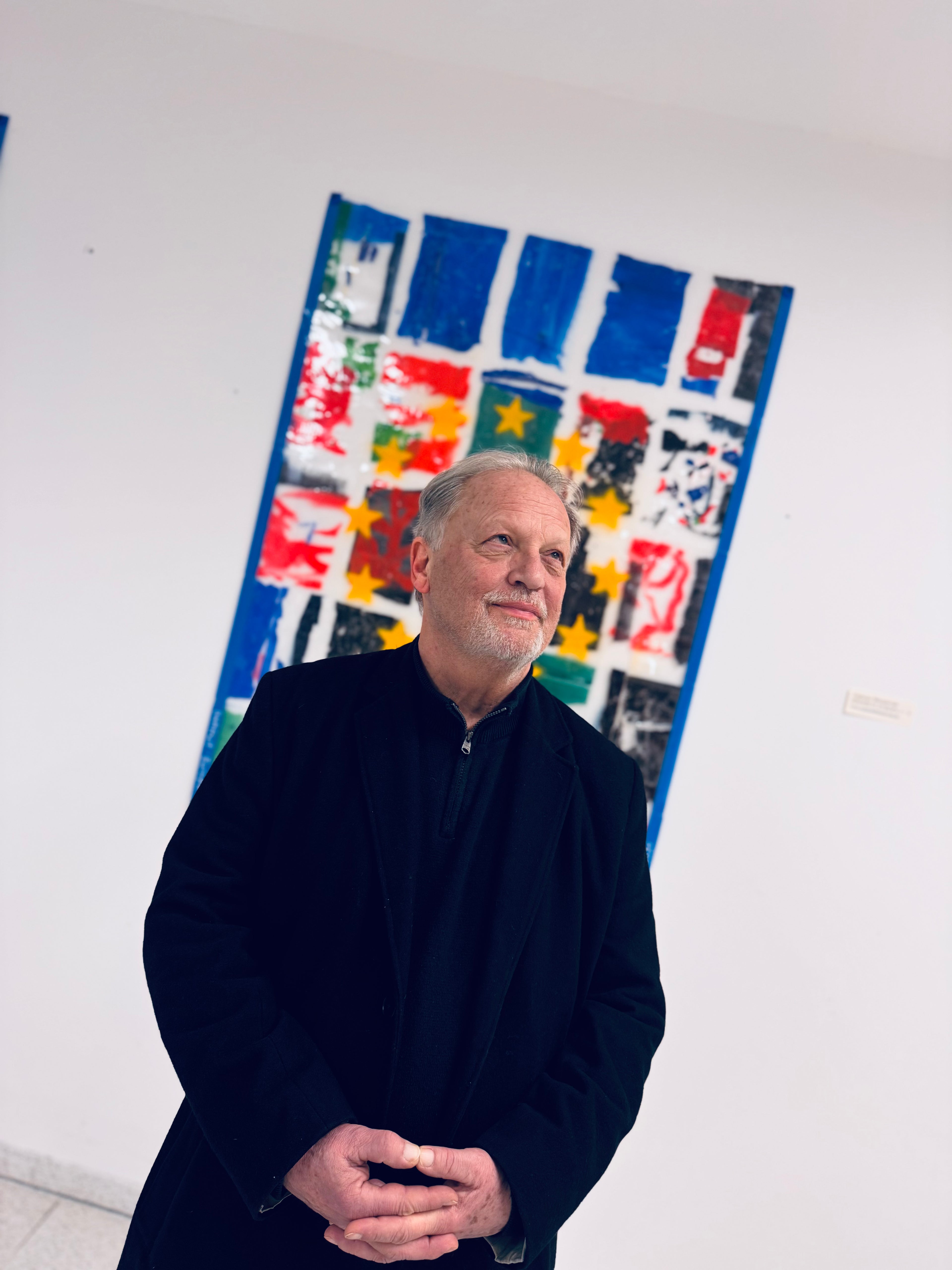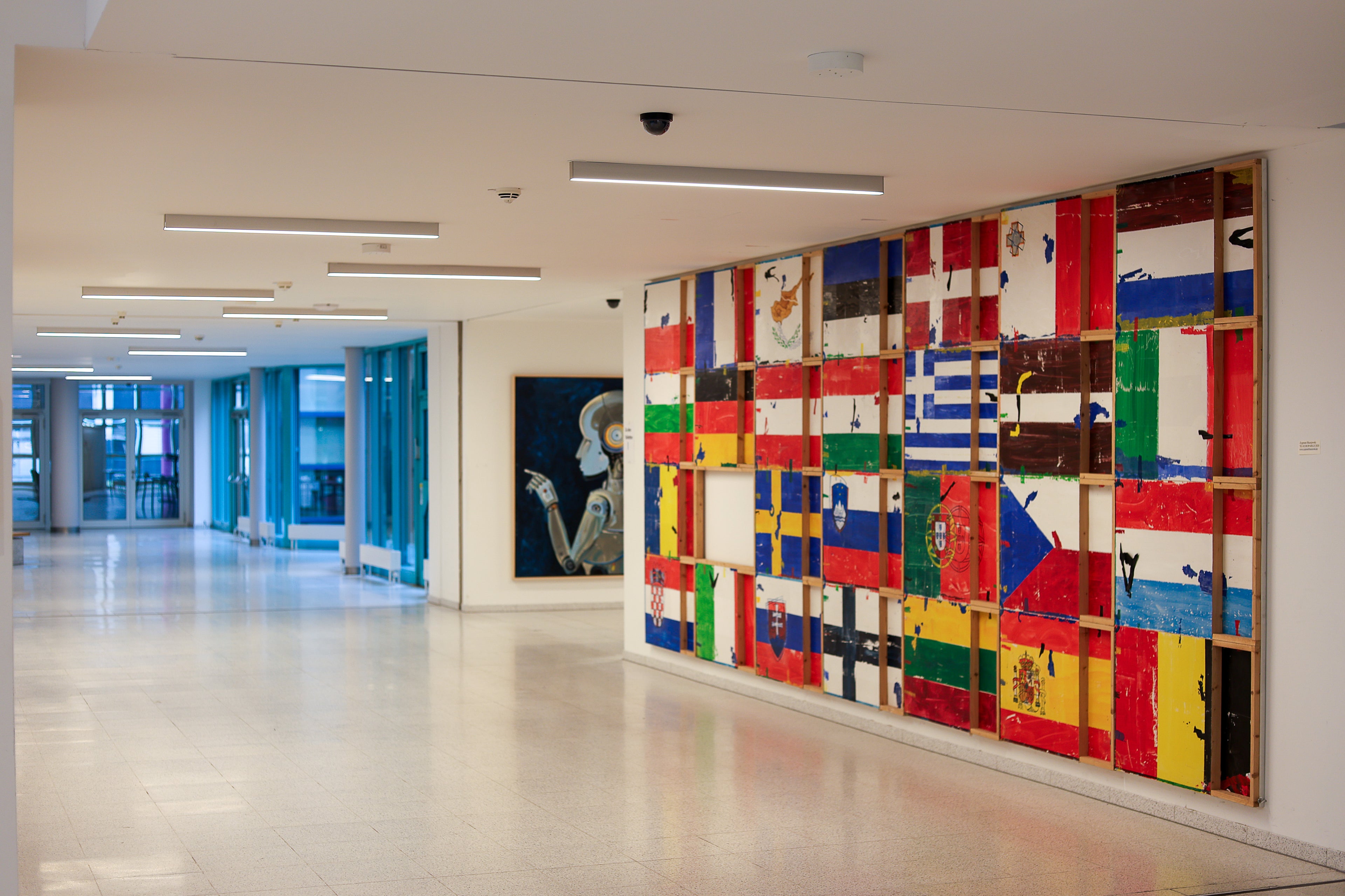 Es zeigt die Flaggen der Mitgliedsstaaten der Europäischen Union – jedoch nicht als glatte Symbolfläche, sondern als verdichteten Bildraum aus Vertiefungen, Spuren, Brüchen und Leerräumen. Das Werk versteht sich als vielschichtiges Zeichen für den Erhalt und die Stärkung der Europäischen Union und lädt zu einer offenen Auseinandersetzung mit der Idee Europa ein.