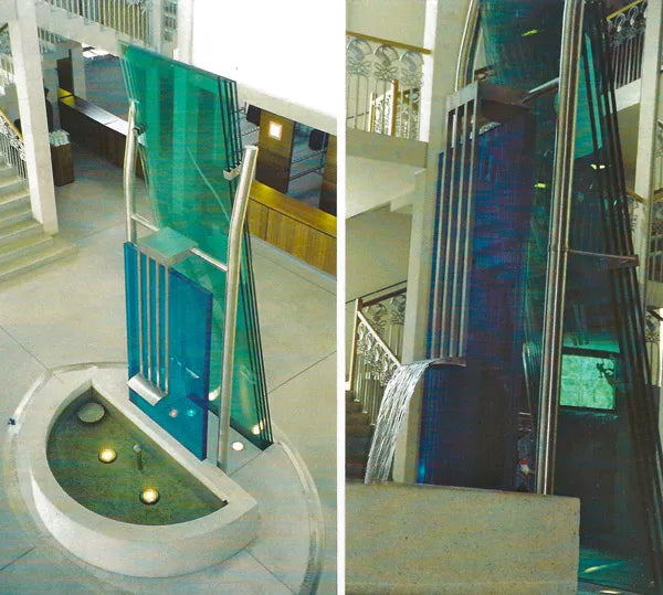 Großformatige Glasinstallation mit Wasserlauf, Edelstahlkonstruktion und Beton-Becken; Licht und Spiegelung als integrale Bestandteile des Werkes.