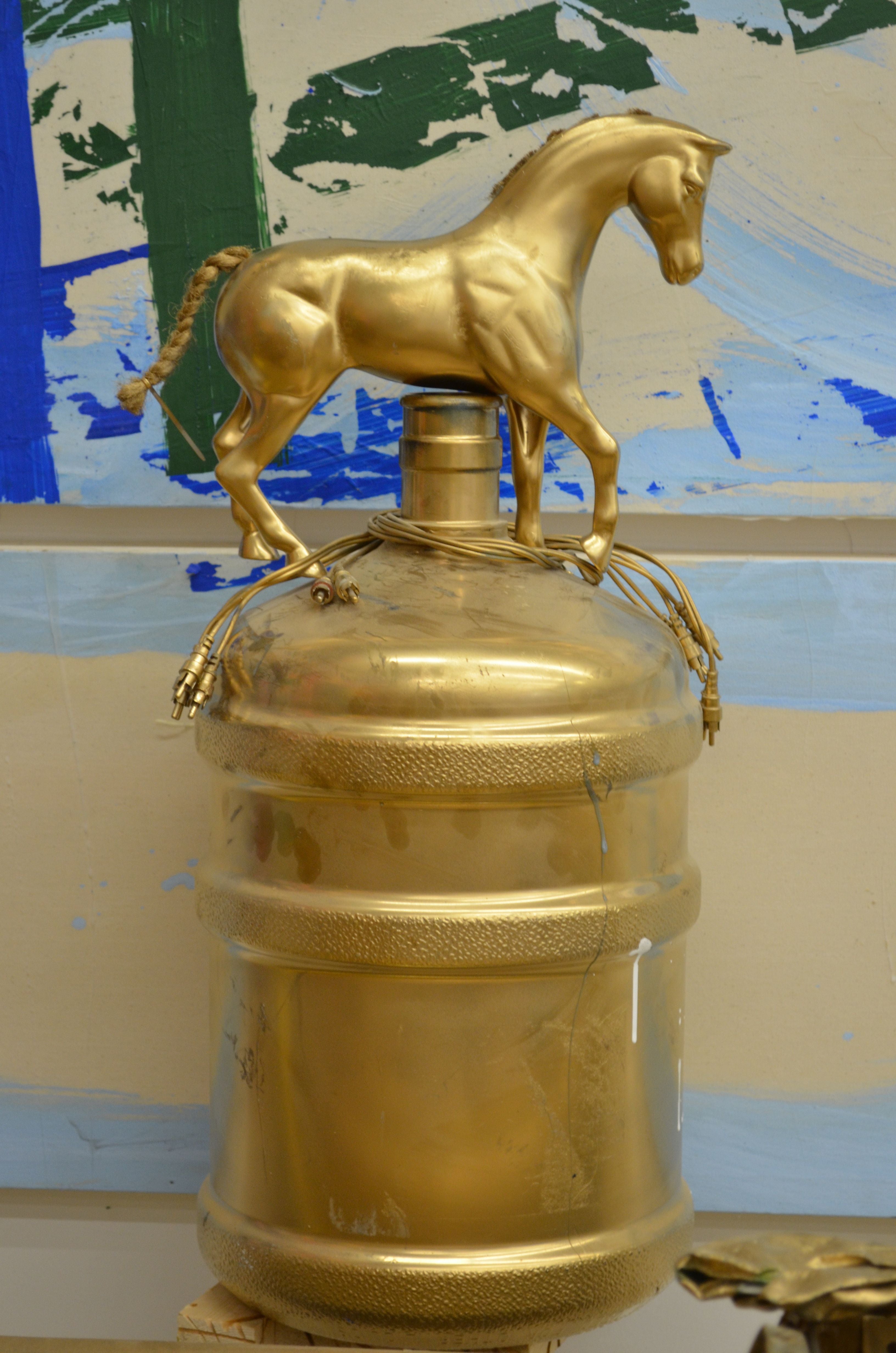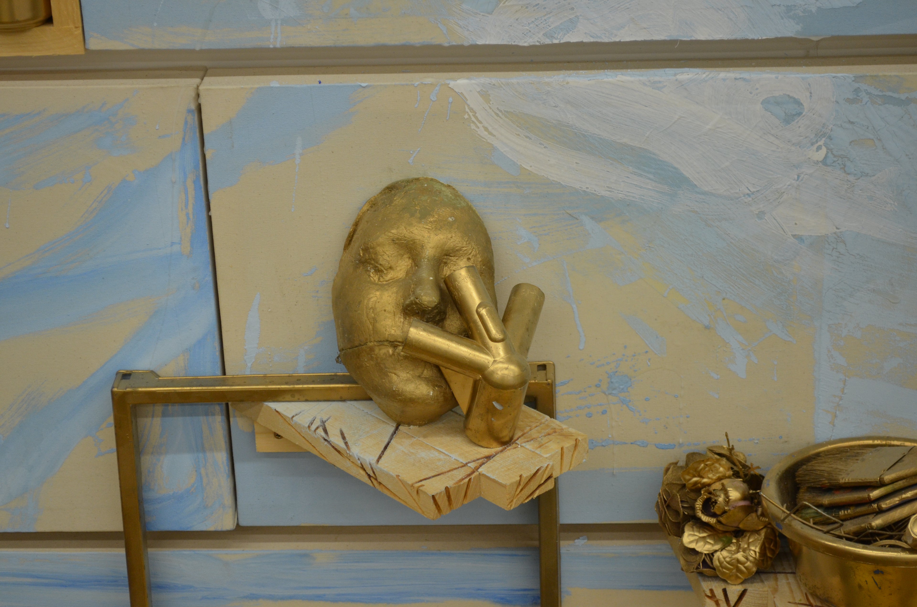 Mittels Goldfarbe bzw. Goldbronze werden die Dinge überzogen – als Akt der Verwandlung, der Trost und Distanz zugleich schafft. Die Geste ist ernst und ironisch: Das „Material“ wird gefeiert und verabschiedet.